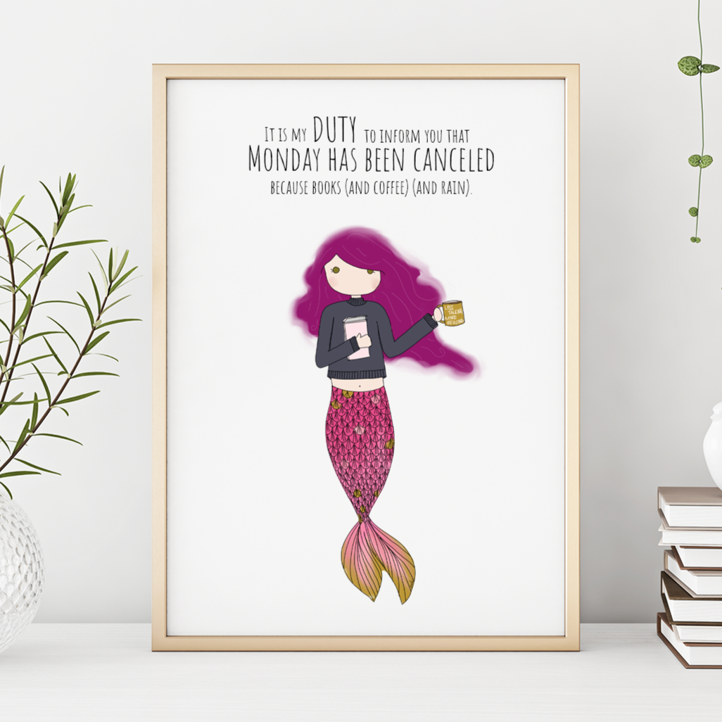 This print reads: It is my duty to inform you that Monday has been canceled because books (and coffee) (and rain). It is signed in pencil in the bottom right corner.