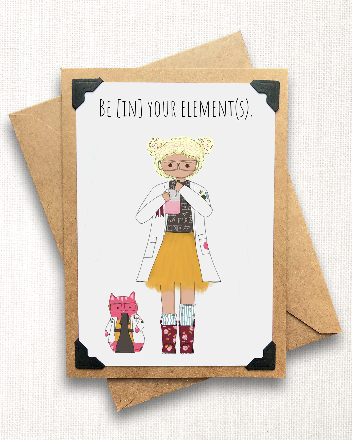 This puckish chemist has finally make her mini print card debut! Made to match her catalyst counterpart, she is ready to kick butt in stem with the help of her kitty sidekick.